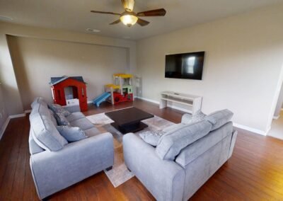 Upstairs, the spacious primary suite features dual walk-in closets and a spa-inspired bathroom with dual vanities and a jetted soaking tub. Additional bedrooms are generously sized, and a large loft with exterior deck access provides flexible space for a game room, home office, or media room.