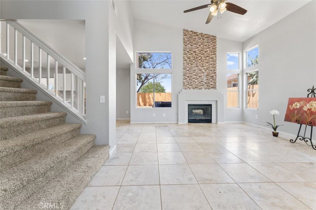 Freshly painted throughout and boasting brand-new carpet, the interior offers a clean, neutral canvas. The open concept downstairs living space includes a cozy fireplace with modern laminate-style facing, tile flooring in key areas, and a functional kitchen with included appliances like a KitchenAid refrigerator and Samsung range.