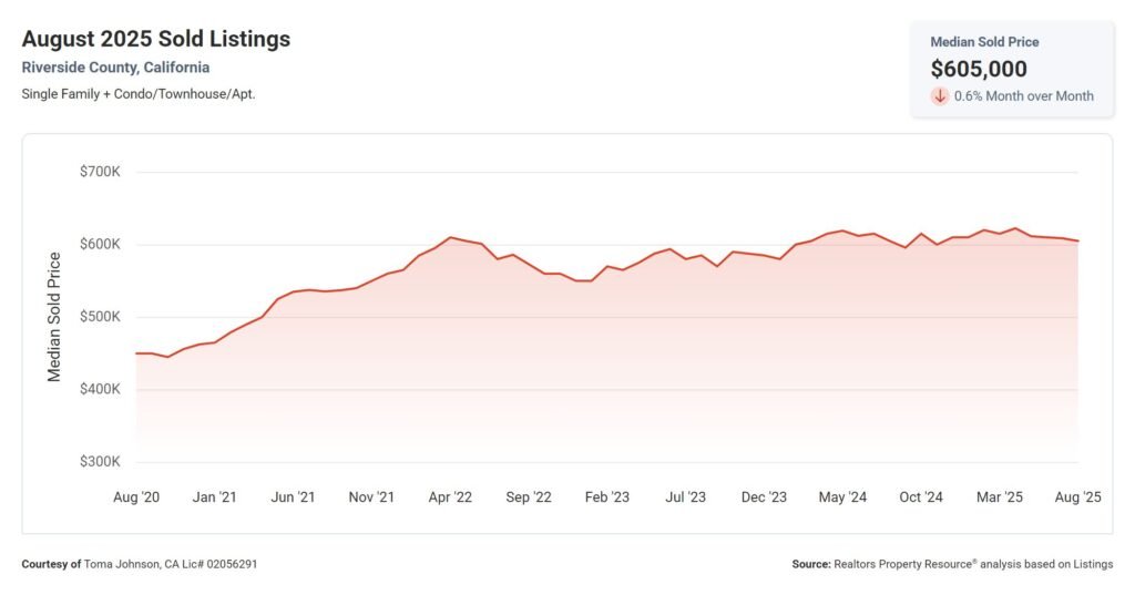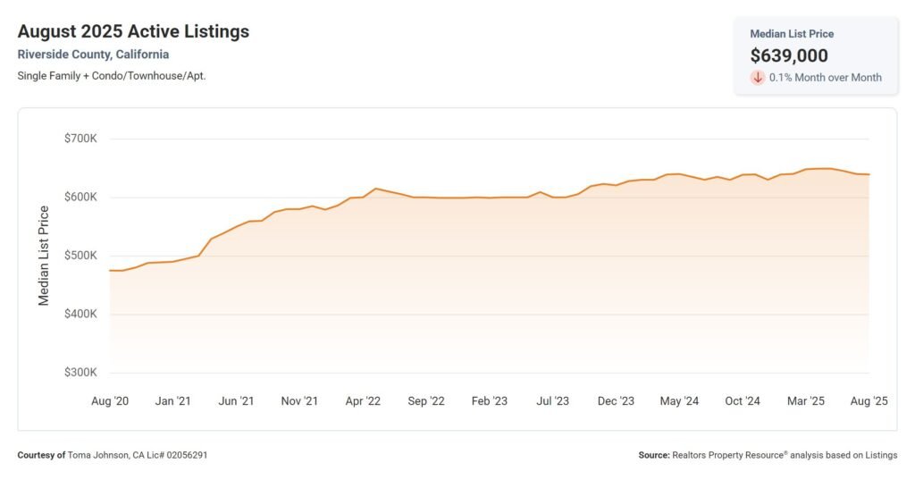 As of August 2025, Riverside County’s median sold price sits at $605,000, while the median list price for active listings is $639,000. Homes are selling at about 98.9% of their list price after an average of 37 days on market. Inventory is still relatively tight at 3.6 months of supply, which technically classifies as a seller’s market.