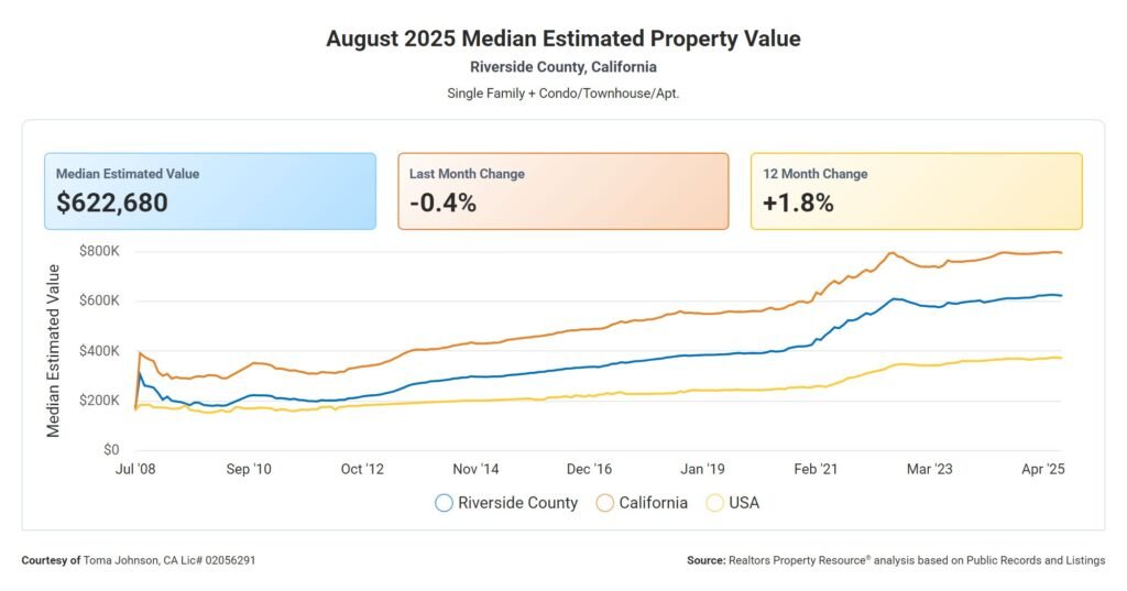 Year-over-year, Riverside County home values are still holding steady, showing modest growth despite recent dips. With rates trending slightly downward, more buyers are expected to re-enter the market, creating opportunities for both sides of the transaction.
